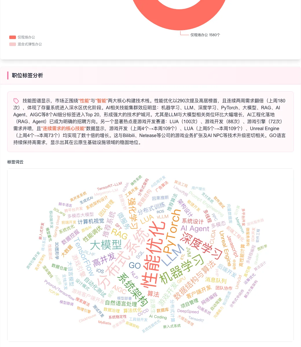 远程办公的幻想在本周彻底破灭。仅现场办公职位占比99.25%(1580个),混合办公仅有12个,上周仅存的1个纯远程岗位已消失。头部大厂出于效率管控、数据安全及硬件调试需求(尤其游戏、AI训练需专用设备),正在严格执行返岗政策。对于执着于数字游民生活的开发者,高薪核心岗的大门正在关闭,必须接受坐班现实。