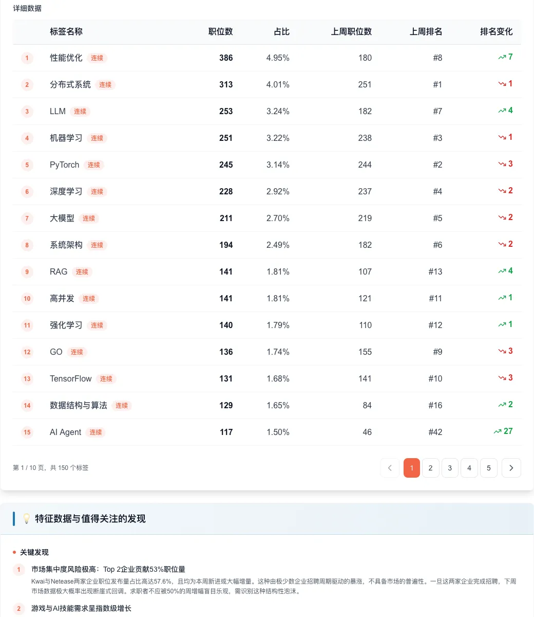 需求环比暴涨数十倍。本周LUA提及100次(上周仅5次),游戏开发88次(上周4次)。这与Netease、Bilibili在游戏业务上的持续加码及AI驱动游戏内容生成(AIGC+GameDev)的趋势深度吻合。
