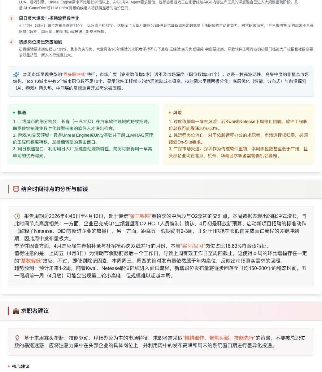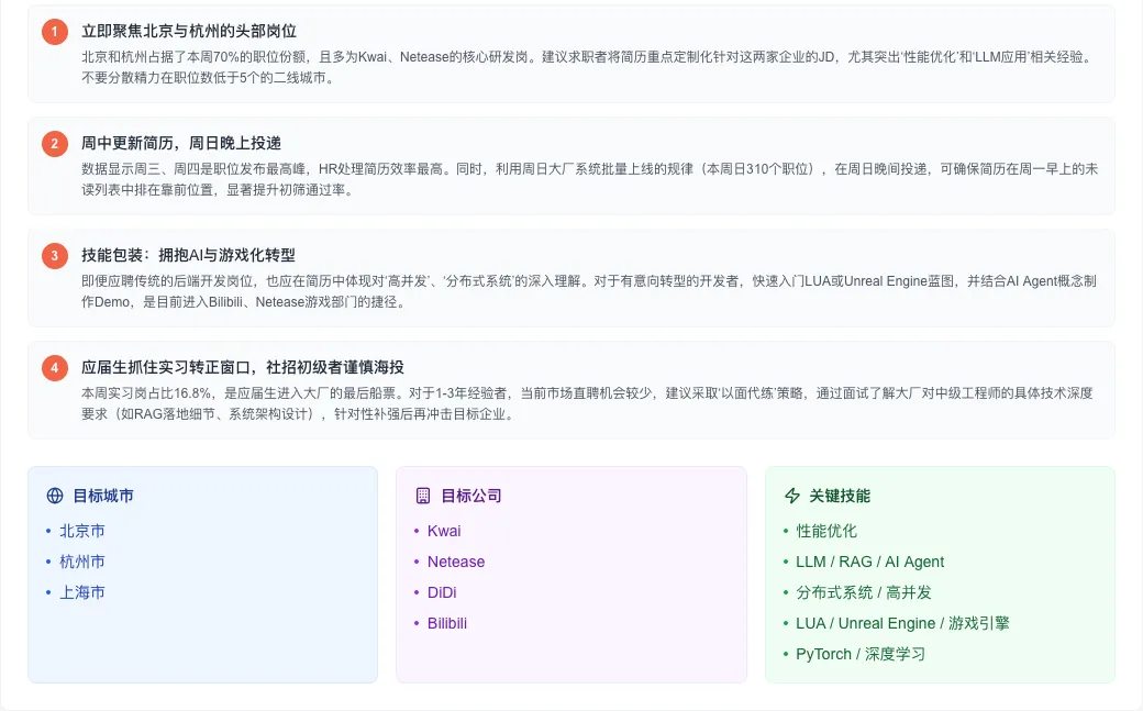 本周70%的机会集中在京杭,且多为头部大厂核心研发岗。不要在小城市零星岗位上耗费精力,集中弹药,针对Kwai、Netease的JD逐字打磨简历,突出性能优化或AI落地经验。