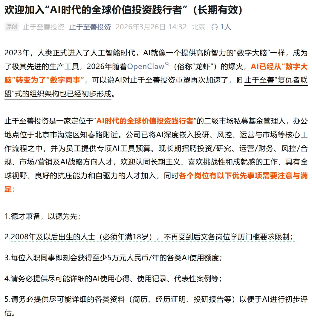 最近,一家叫"止于至善"的私募基金干了一件让整个金融圈睡不着觉的事——他们发布了一份招聘公告,公开宣布:年满18岁,具备高中或同等学历,就可以应聘投研、运营、风控、营销等核心岗位。