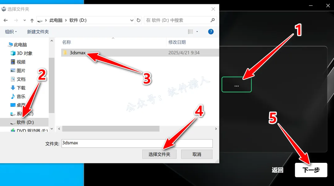 6.更改安装路径:①点击【···】;②点击【软件(D:)】;③新建一个文件夹,命名为:【3dsmax】;④点击【选择文件夹】;⑤点击【下一步】。