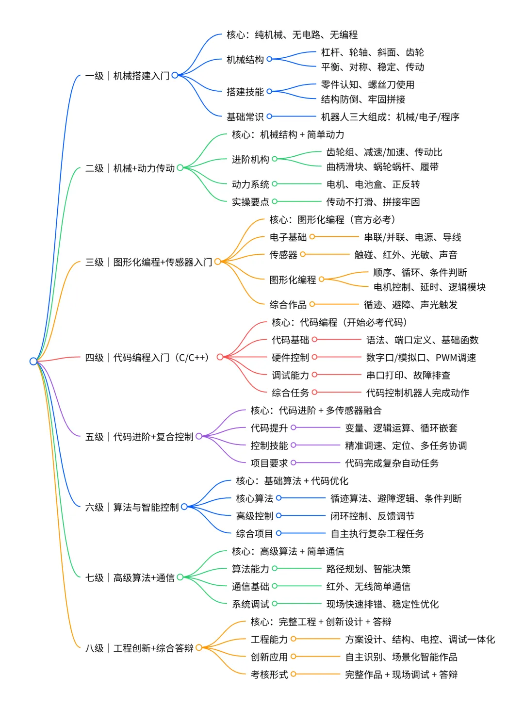 全国青少年机器人等级考试是中国电子学会旗下的一项综合考级系统,共8级,围绕机器人涵盖机械原理、电子电路、传感器控制、编程等多项理论与实操技能,是当前认可度最广的一套技能评定系统。