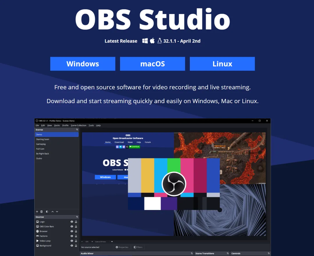 OBS Studio 是一个强大的录屏和直播推流软件首先它支持高清录制和高清音频规格,还支持高码率推流还可以设置多个屏幕,录制软件窗口,也支持相机外置设备它还有多重混音支持Windows,Linux 和Mac