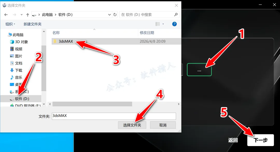 6.自定义安装位置:①点击【...】;②点击D盘;③新建一个文件夹并重命名为【3dsMAX】;④点击【选择文件夹】;⑤点击【下一步】。