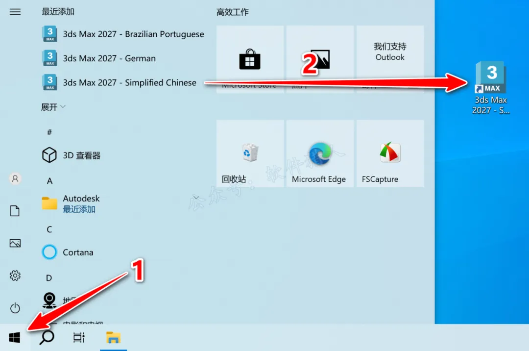 14.点击系统开始菜单,将【3ds Max 2027 - Simplified Chinese】拖至桌面建立快捷方式。