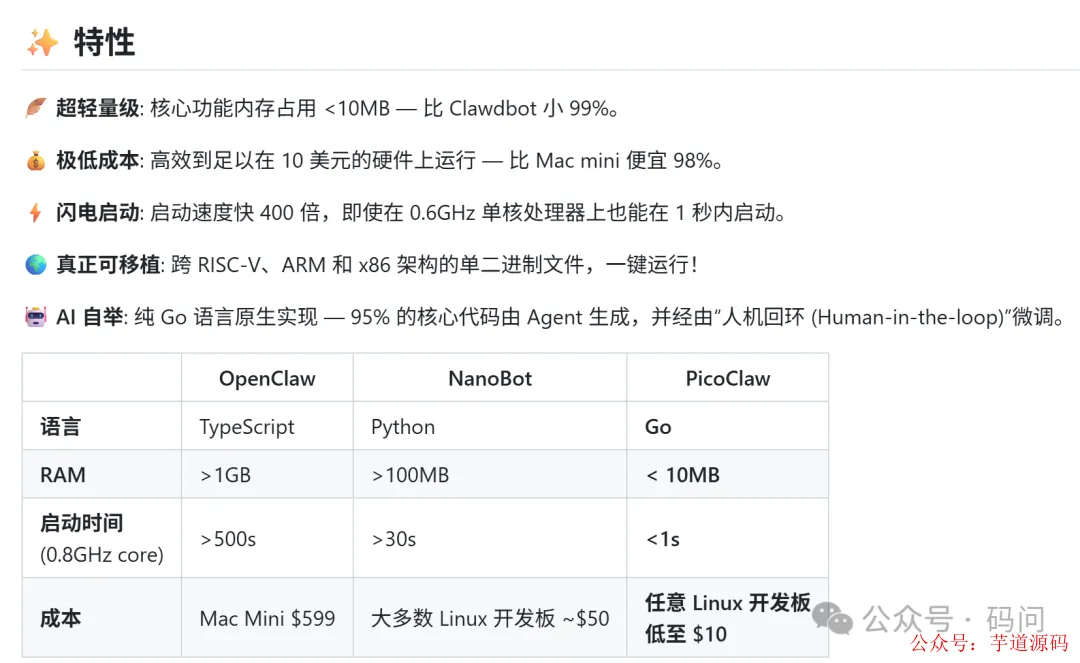 PicoClaw 走的是极致轻量路线。Go 从零重构,经历了一个"自举"过程——由 AI Agent 自身驱动整个架构迁移。
