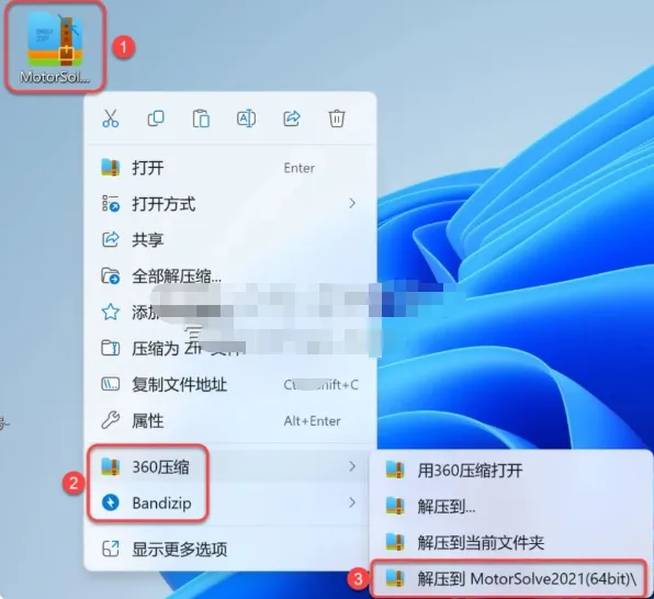 1.解压安装包:①鼠标右击【MotorSolve2021(64bit)】压缩包②选择电脑上安装的解压软件(如:360压缩)③点击【解压到MotorSolve2021(64bit)】。