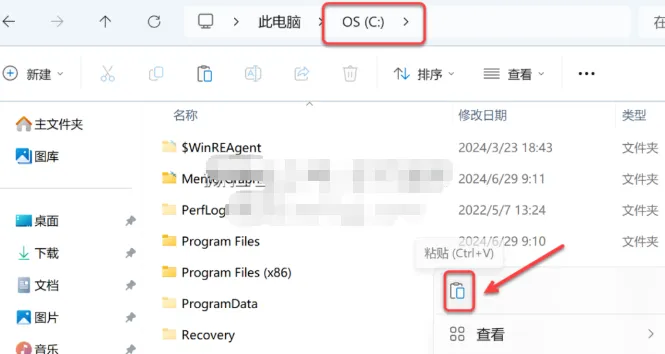 13.打开电脑C盘,鼠标右击空白处选择【粘贴】。