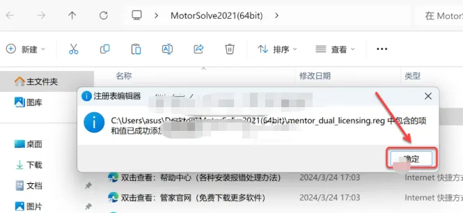 22.打开安装包解压后的【MotorSolve2021(64bit)】文件夹,双击运行【mentor_dual_licensing.reg】注册表文件。