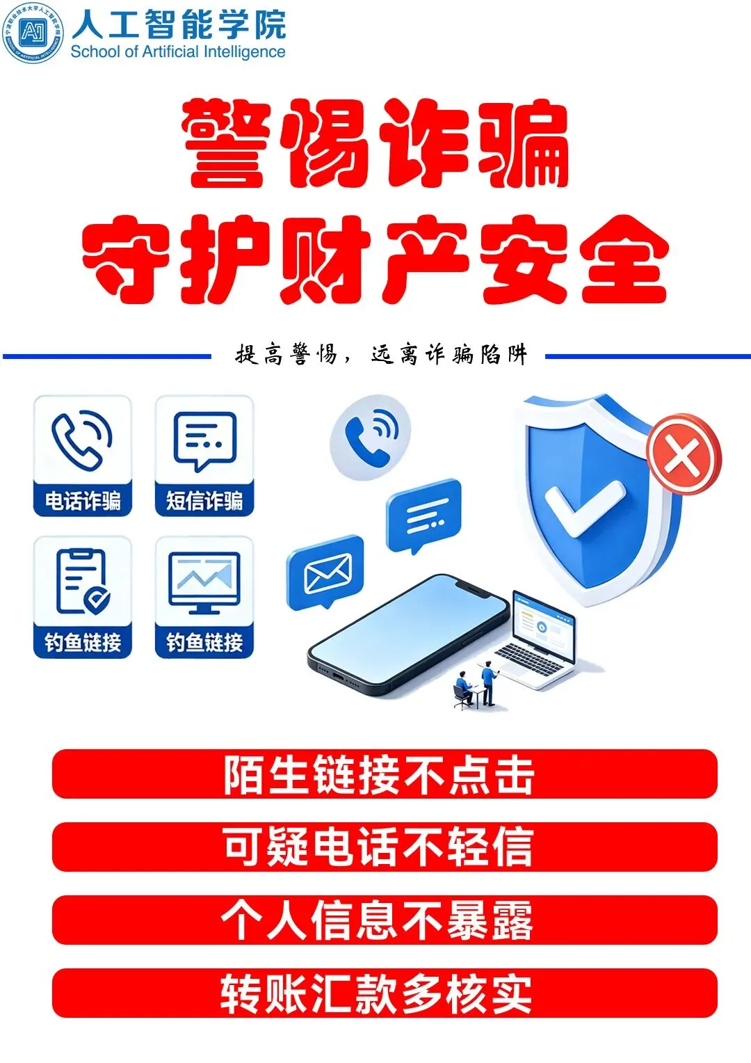 AI安全卫士|警惕诈骗,守护财产安全!END人工智能学院新媒体工作室和信宣部联合出品图片| 信宣部 唐明鸿一审 | 黄攀二审 | 张颖超终审 | 方科亚微信公众号:宁职大人工智能学院(nzdrgznxy)抖音:宁职小电团(NBPT_DX666)