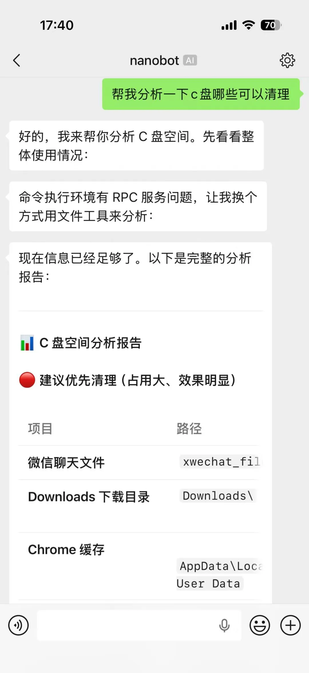 我觉得下面这个使用场景就挺能说明问题。比如让它帮你看一眼 C 盘还有哪些东西能清,很多人自己做这件事,最后都会变成一个文件夹一个文件夹地翻。交给 Agent 先扫一遍,再给你列建议,效率会高很多。