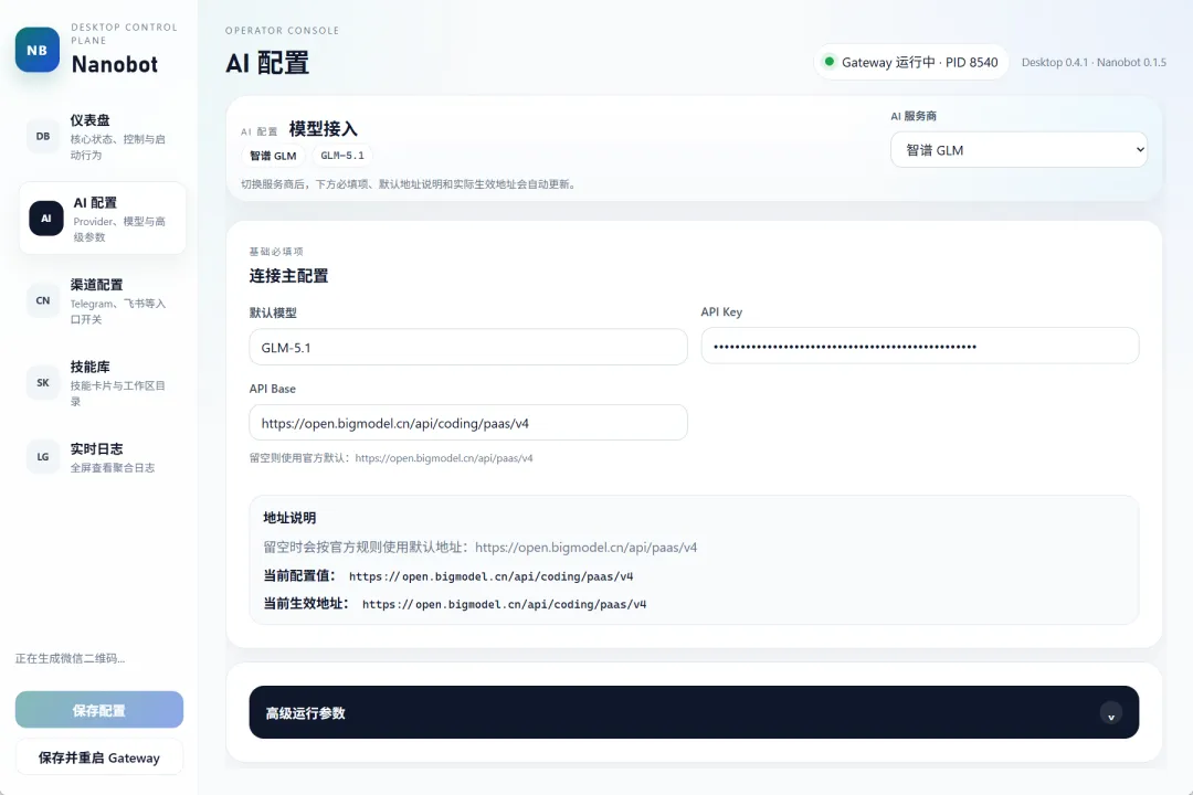 第二,不用手改一堆配置文件。AI 地址、API Key、模型选择、聊天渠道这些,都可以直接在界面里填。
