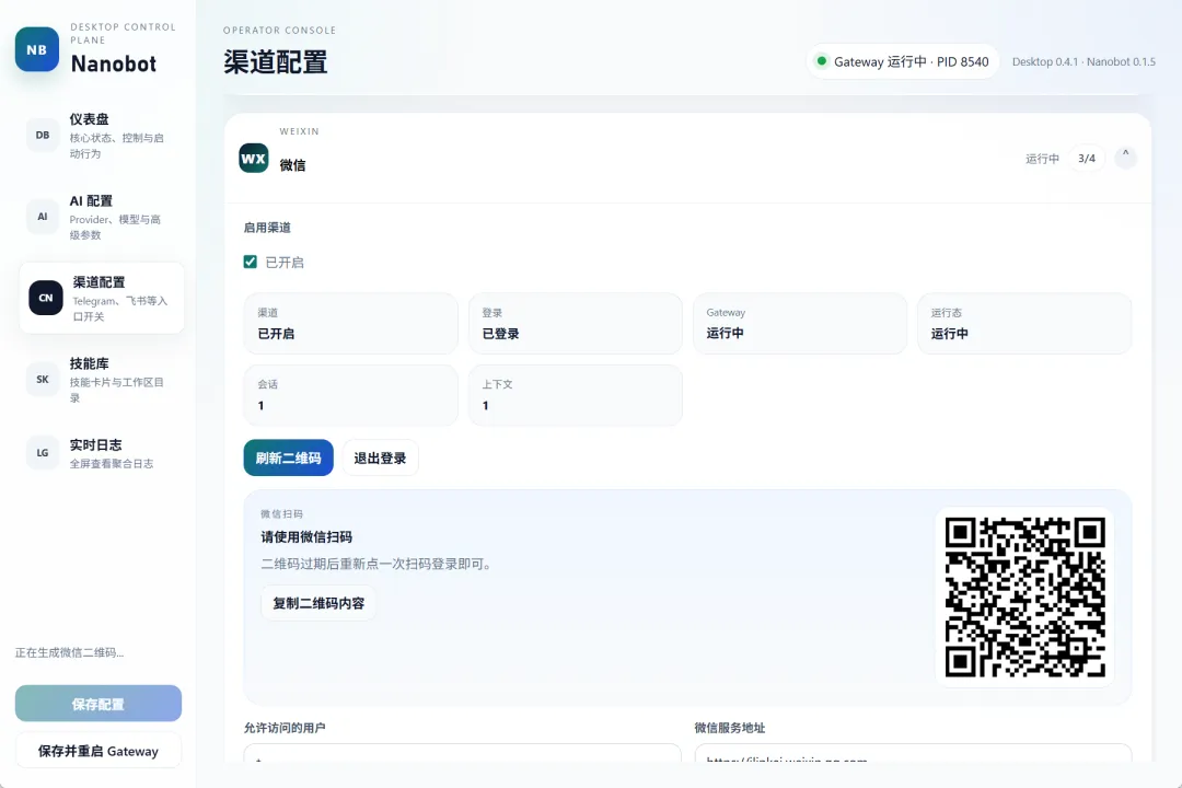 Dashboard 概览 浏览器聊天界面 配置管理 Channel 管理 状态监控