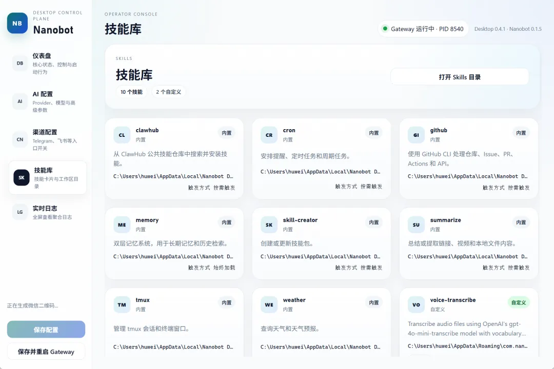 第三,常用信息能直接看见。技能库可以浏览,日志也能直接看,出问题的时候不至于两眼一黑。