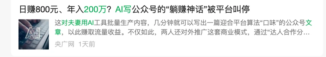 先看那个最大的新闻。一对夫妻用AI写文章,赚了200万。怎么做的呢?5分钟用AI生成一篇文章,一篇能跑出30万阅读,光流量主收入就1000多块。然后注册一堆号,拉亲戚一起养号,批量AI写文挣钱。