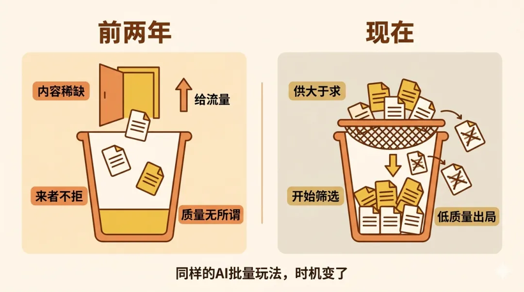 大量新的公众号进来了,内容的产量已经严重大于需求了。供大于求的时候,平台就要开始筛选了。以前那些AI批量生产的低质量内容,以前睁一只眼闭一只眼放过去的,现在不行了。