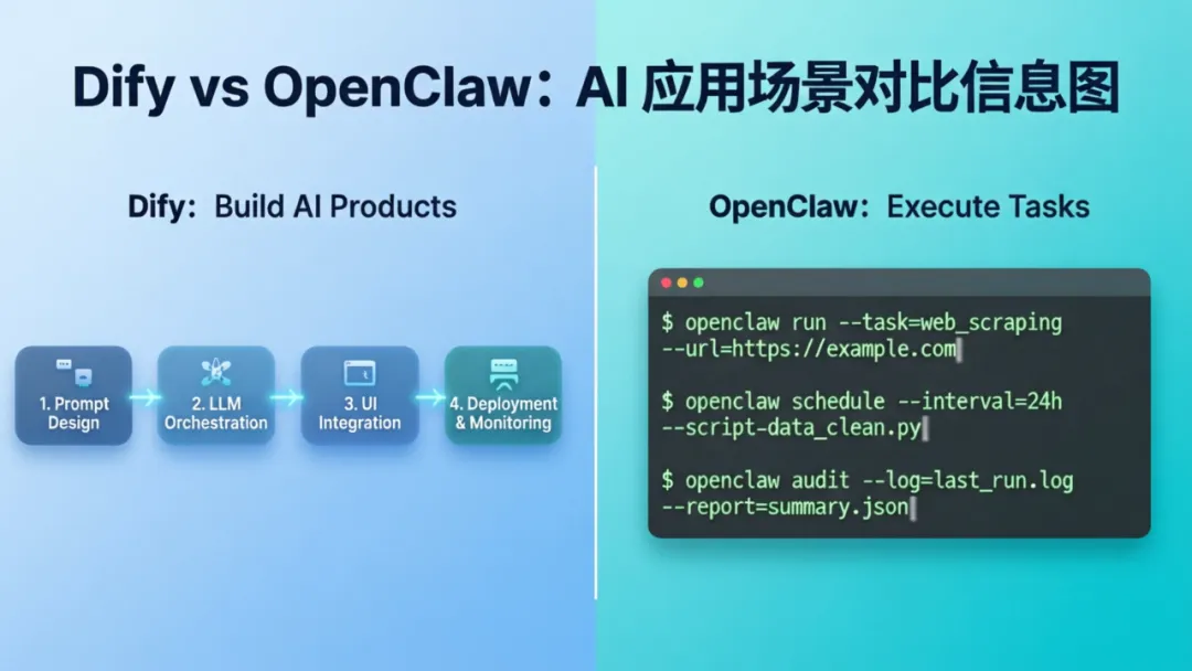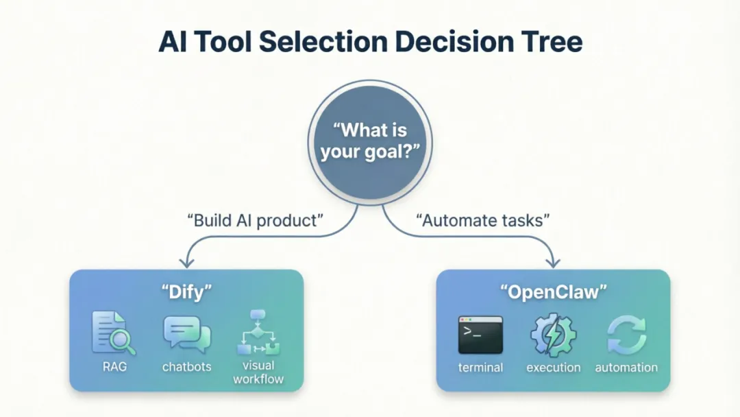 • 给企业搭知识库问答机器人 → Dify • 团队非技术人员占比高,需要可视化 → Dify • 流程固定、调整频率低、演示导向 → Dify • 需要 AI 自主决策、跨系统自动化执行 → OpenClaw • 工作流复杂、多步骤、多工具调用 → OpenClaw • 数据隐私要求高,必须本地运行 → OpenClaw