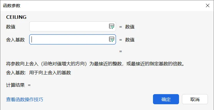 功能描述:函数描述为向上舍入,结果的绝对值≥原数值的绝对值;结果等于“舍入基数”的整数倍且最接近第一个参数的数字。