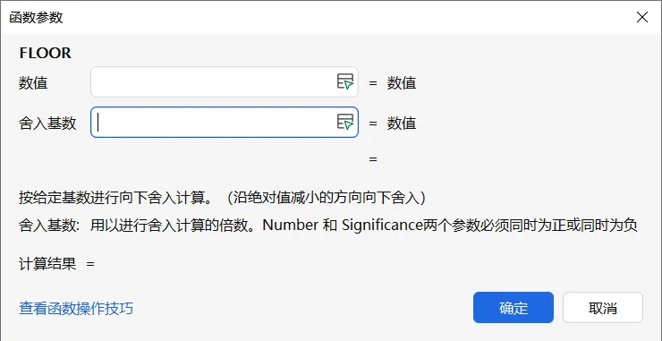 功能描述:与CEILING函数描述相反,为向下舍入,结果的绝对值≤原数字的绝对值;结果等于“舍入基数”的整数倍且最接近第一个参数的数字。