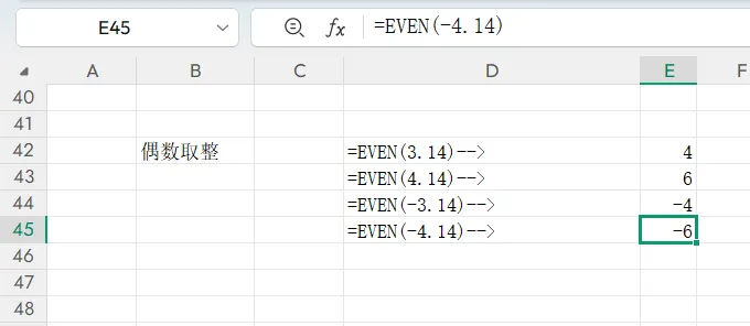 ·偶数取整:EVEN(取最接近偶数,绝对值增大)