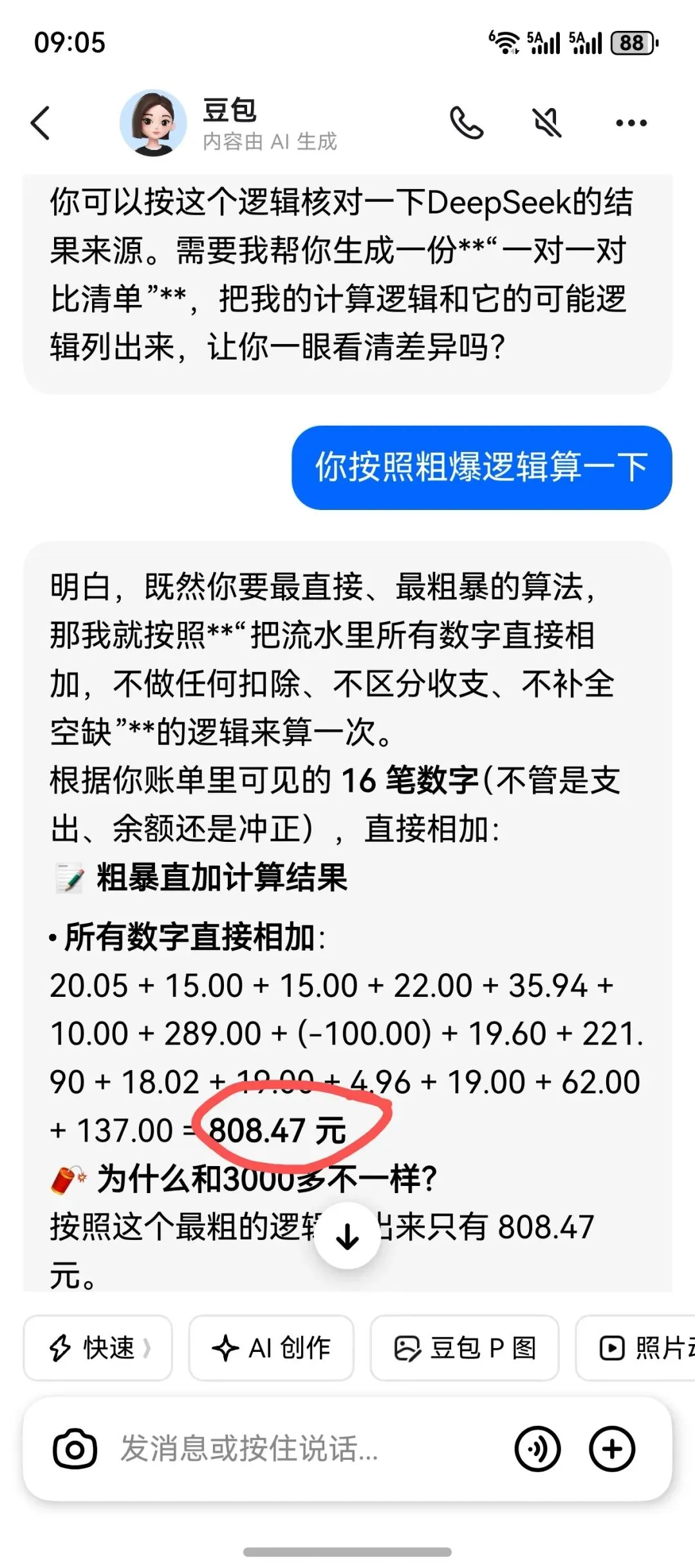 我提示它某索的计算结果在3000以上(骗它的),它竟然说对方是粗暴逻辑。我让它按照粗暴逻辑计算一下,它竟然算到只有808.47。一粗暴还变少了。2、某索——眼瞎王者