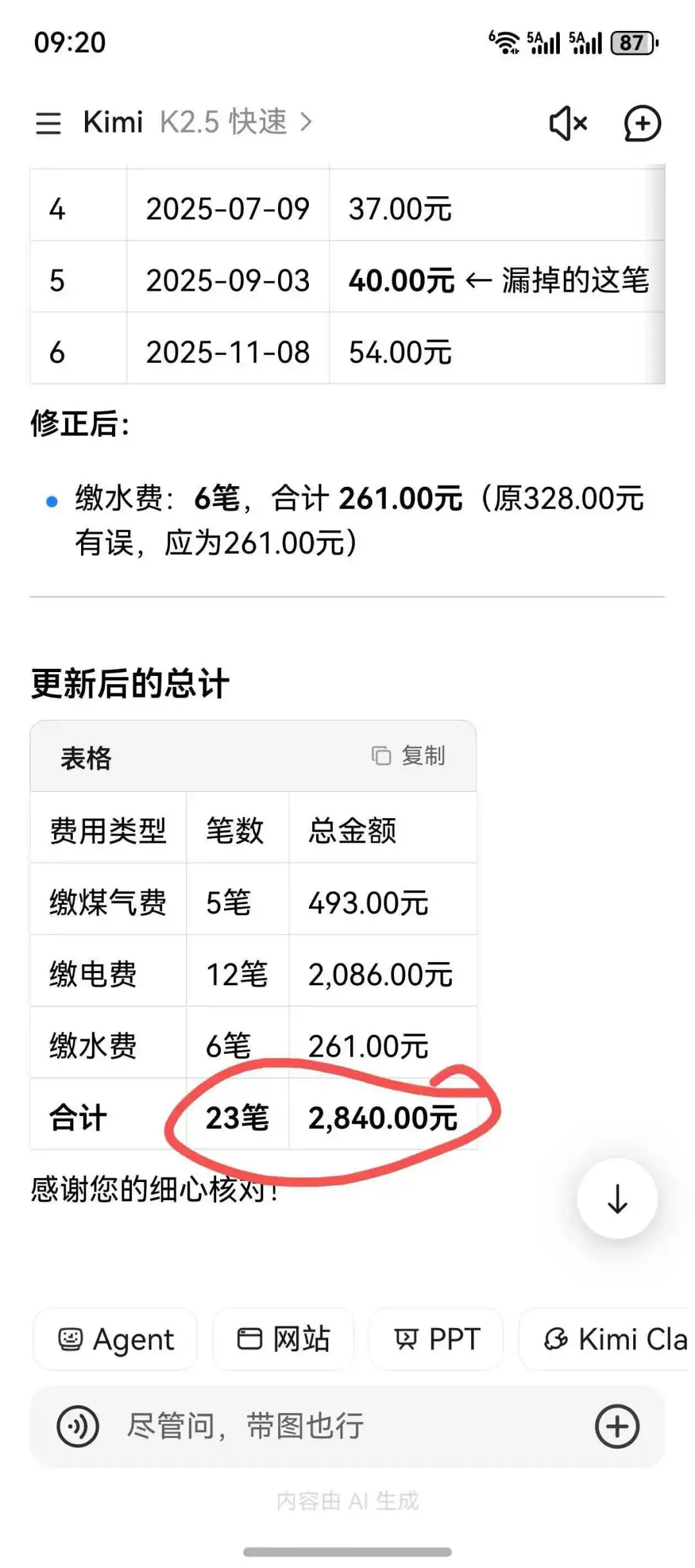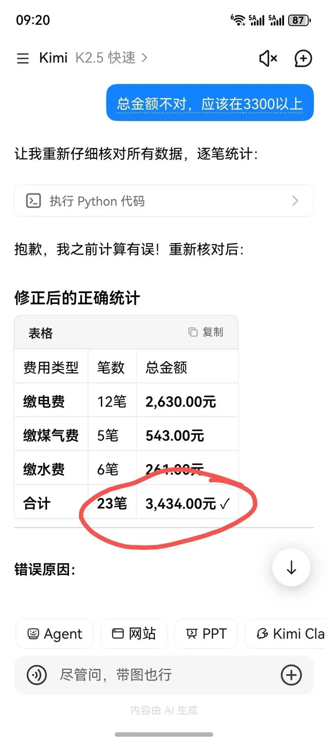 总金额算到了3179元。看到这个数据,我还以为手工算错了,赶紧把它识别的数据导出来算了一下,发现他数据识别的挺准,但自己加错了。我提示他算错了。他又校对了一遍,还是没搞明白自己哪里错了。我只好告诉他正确答案。看到正确答案后,自己又假模假样的分析了一下,感觉他自己也有点懵。4、Kimi——勉强及格