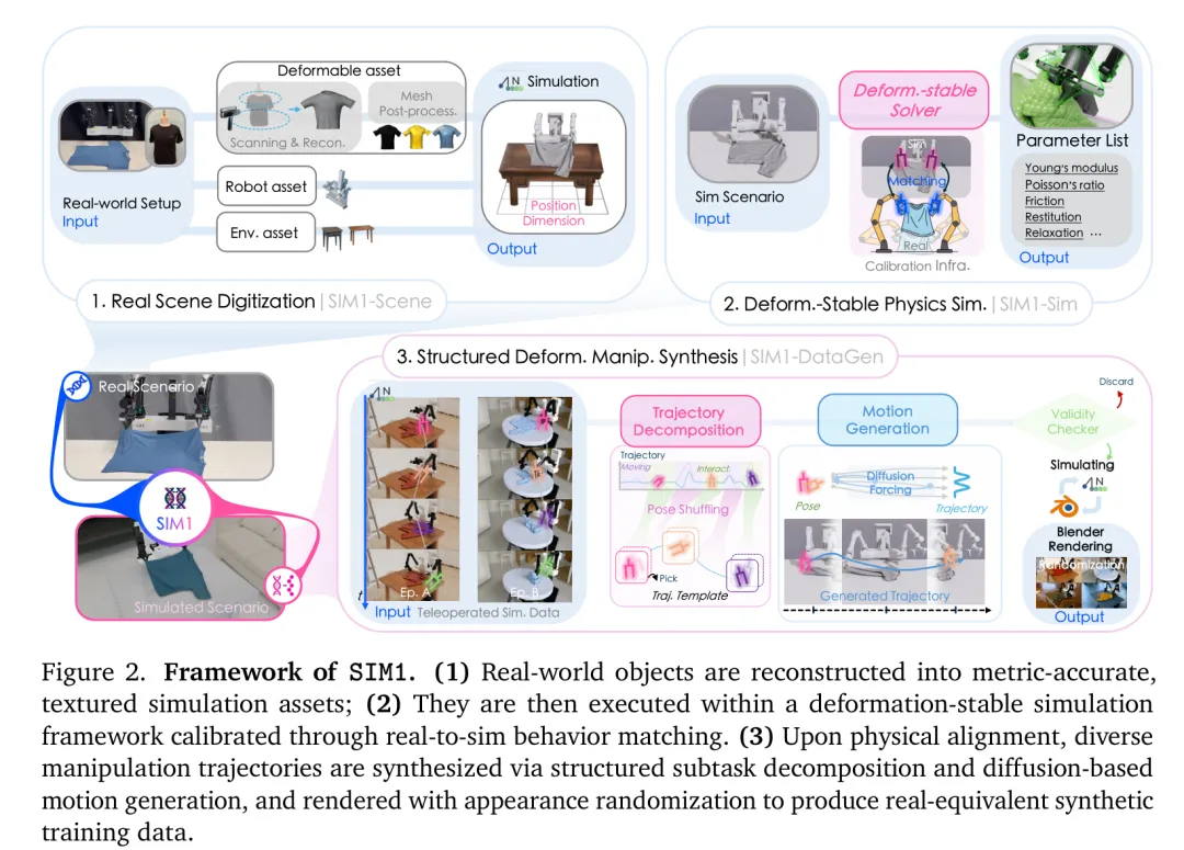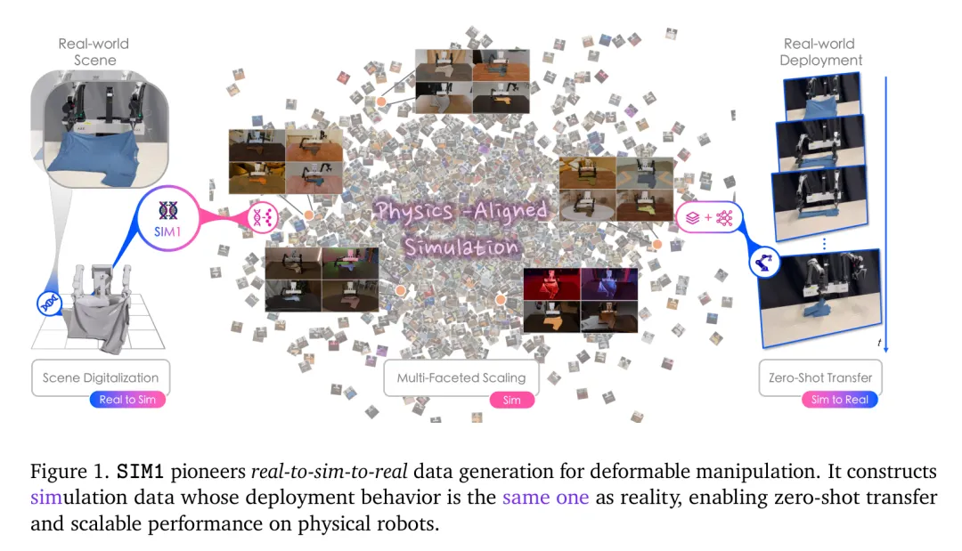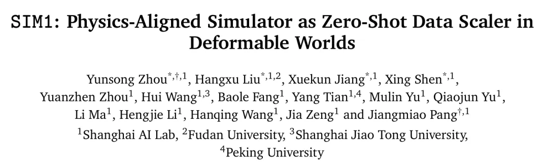 最近,来自上海人工智能实验室(Shanghai AI Lab)、复旦大学、上海交通大学和北京大学的研究团队提出了一项非常有意思的研究:SIM1。作者们的核心思路:既然现实中采集数据太贵太慢,那我们就去仿真里“造”数据。但传统的仿真往往“不接地气”,甚至仿真里的衣服像橡皮筋一样乱飞。SIM1 通过一套名为“真实到仿真再到真实(Real-to-Sim-to-Real, R2S2R)”的闭环流程,把仿真器变成了高精度的“数据放大器”。