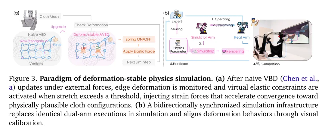 传统的物理解算器在处理机器人抓取布料时,经常会出现局部拉伸过大的情况。SIM1 在解算过程中加入了一个显式的应变约束(Strain Constraint)。简单来说,就是给布料的每一条边都设置一个“警戒线”,如果拉伸超过了预设比例 (论文中设为 5%),系统就会激活一个虚拟的弹性约束力。