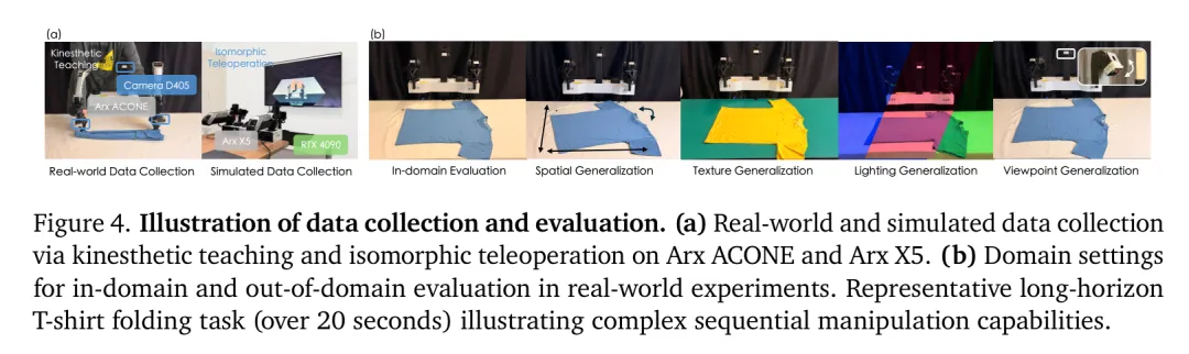 研究团队在 ARX ACONE 双臂机器人上进行了测试,任务是长周期(超过 20 秒)的 T 恤折叠。