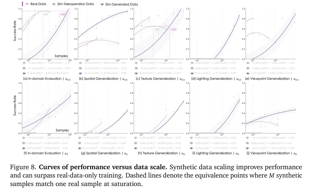零样本迁移成功率:“仅”使用纯仿真生成的合成数据训练的模型,在真实环境下的 T 恤折叠任务中达到了 90% 的成功率。 泛化能力拔群:在纹理泛化测试中,SIM1 训练的模型成功率比仅用真实数据训练的模型高出 50% 以上。 数据等效性:有意思的是,研究发现,大约 15 条 仿真轨迹的效果等同于 1 条昂贵的现实采集轨迹。