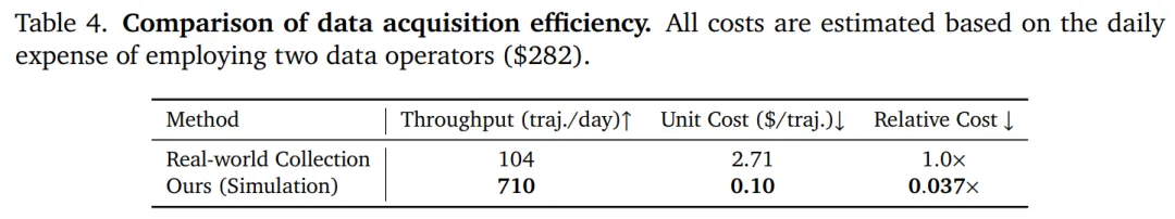 现实中采集一条轨迹的成本约为 2.71 美元,而 SIM1 仿真生成的成本仅为 0.10 美元,降本幅度高达 27 倍。