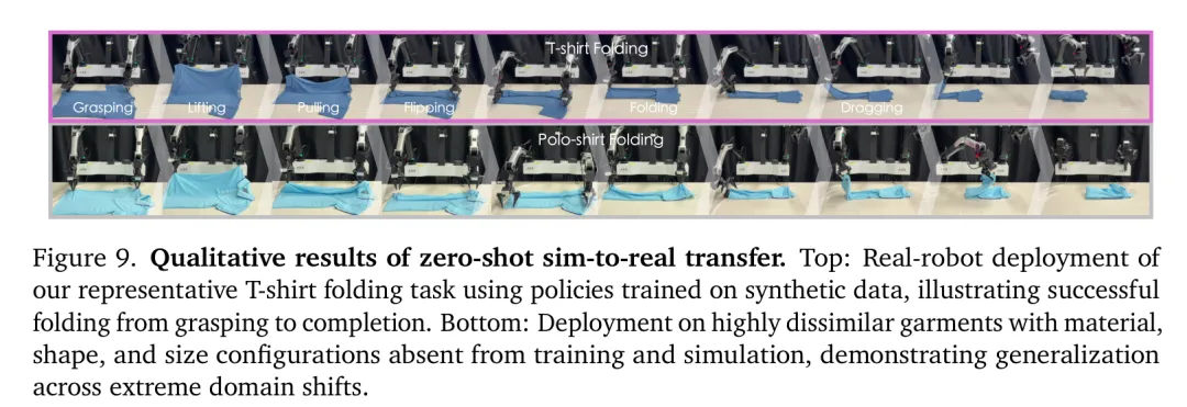 以往的仿真到现实(Sim-to-Real, S2R)迁移,在处理刚体时效果不错,但在处理布料时会遇到三个“大坑”:首先是几何不匹配,仿真里的衣服模型往往是随手画的,和现实中的尺寸、纹理对不上;其次是动力学脆弱,物理引擎大多是为刚体优化的,模拟布料时经常出现过度拉伸、穿模或者不自然的抖动;最后是动作基元太简单,简单的“抓取-放置”根本搞不定复杂的折叠动作。