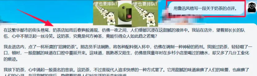 输入:“用鲁迅风格写一段关于奶茶的点评”