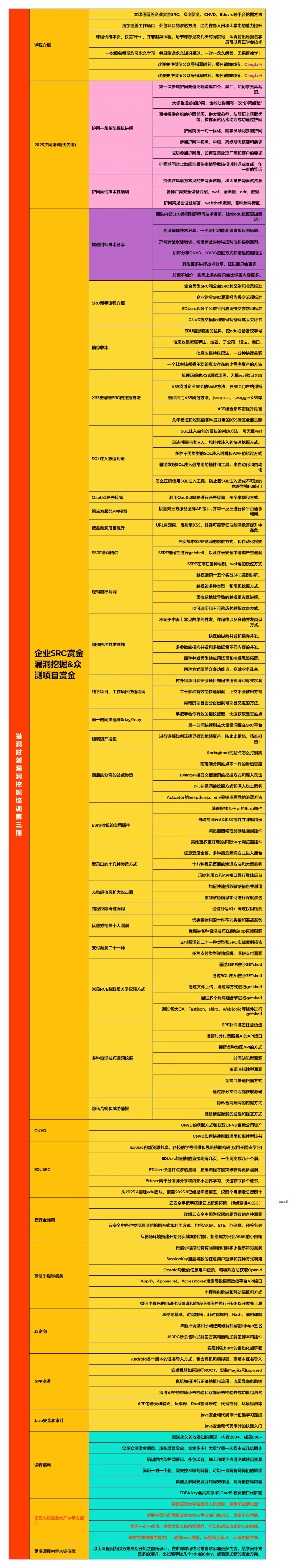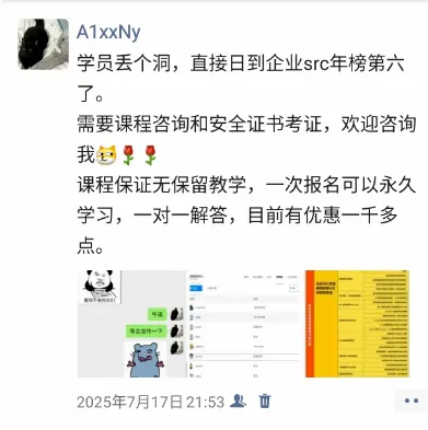 我们是一个综合性的挖洞培训,不仅仅是搞SRC、赏金,也更注重学员的综合挖洞能力,让你能够在安全这个行业上面扎根立足,对于学生等还会额外提供校招讲解和资源、规划,更好的入职大厂。