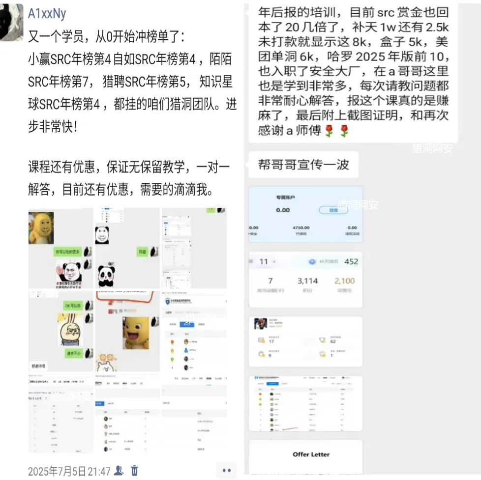 在企业SRC,有不少学员位列2025年榜前十,下面举一些反馈例子,真实可查。