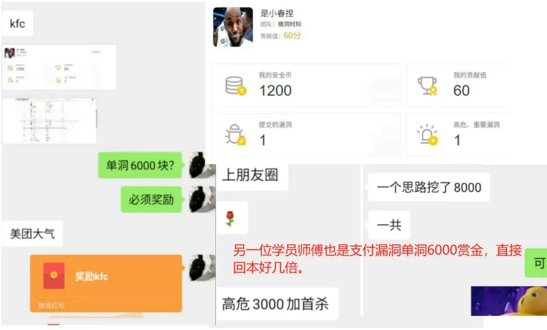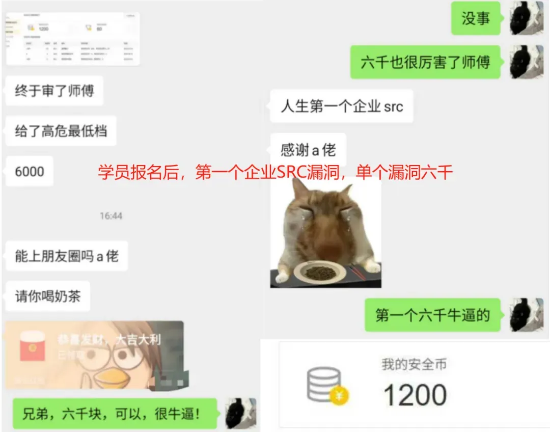 我这边也是有对接的公司,有内部的众测项目,因此拿到项目也会分配个学员们一起挖洞,挖到就是你得钱。其次,对于线下,线上渗透项目,包括护网,拿到名额也会优先分配给学员。