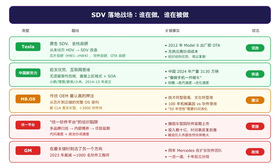 一位资深行业分析师的评价很残酷但准确:拥有几十年历史的汽车集团,无法从零开始构建软件能力——不是因为工程师不行,而是因为组织惯性太大。SDV 要求的不只是技术能力,而是整个组织和决策结构的重建。这是很多有技术实力的公司做不到的事。