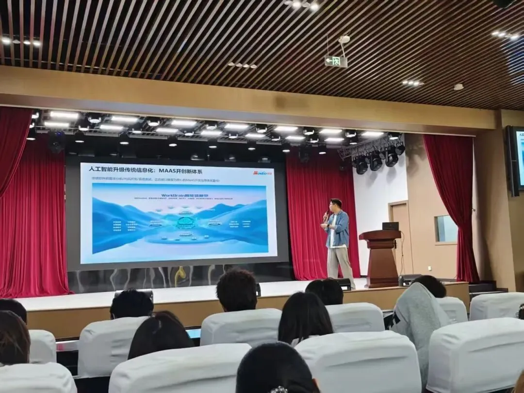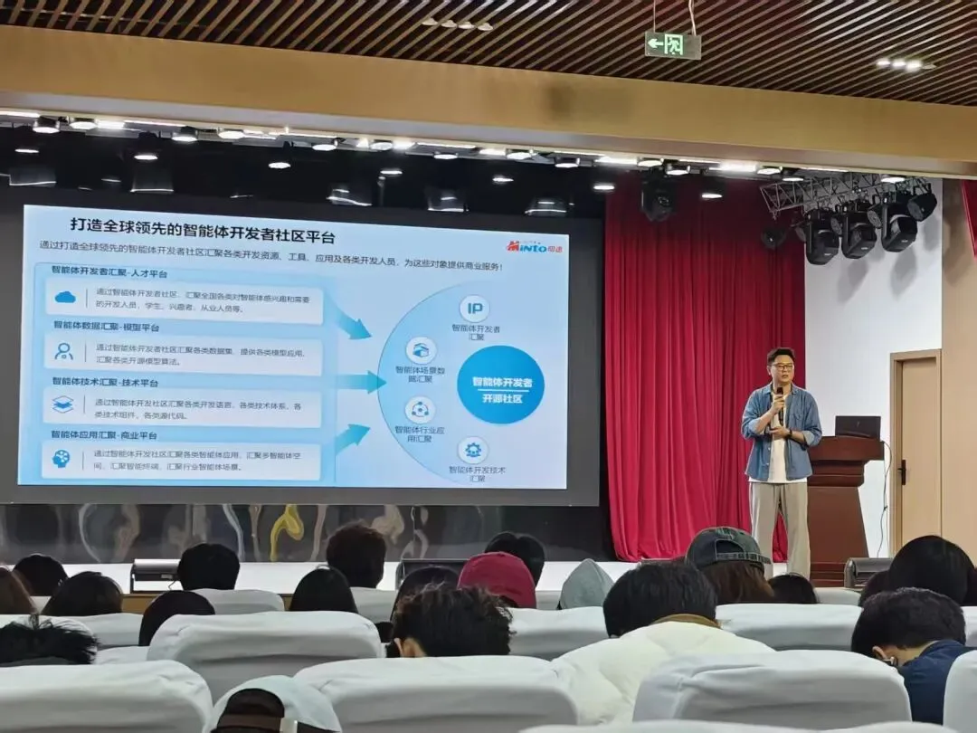 面向学生创新创业实践,讲座重点介绍了MAAS 模型即服务与 “人人都是开发者” 生态。主讲人详细分享了明途科技面向开发者提供的免费算力、免费存储、免费流量、免费 Token 等 4T 基础服务,以及智能体搭建平台、可视化开发工具、行业垂类模型训练、具身智能终端 DIY、商业变现渠道、赛事活动、合伙人计划等全链条支持,鼓励同学们大胆尝试智能体开发、数字人创作、交互设计、AI 文创等创新项目,将创意转化为可落地的创业成果。