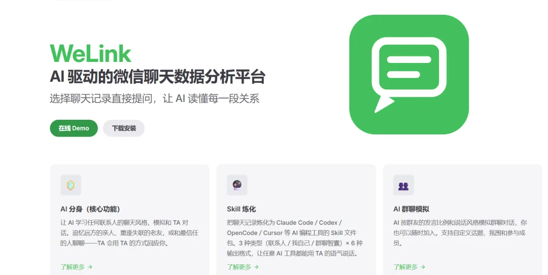 docker compose -f docker-compose.demo.yml up访问 localhost:3418 即可体验,预置了完整联系人列表与模拟消息。