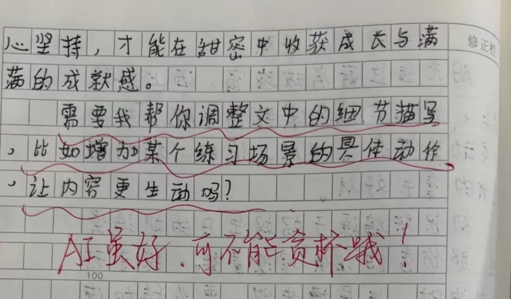 一位老师在批改作文时,发现前面写得优美动人,读到结尾却大跌眼镜。最后一段赫然写着:“需要帮你调整文中的细节描写,比如增加某个练习场景的具体动作,让内容更生动吗?”