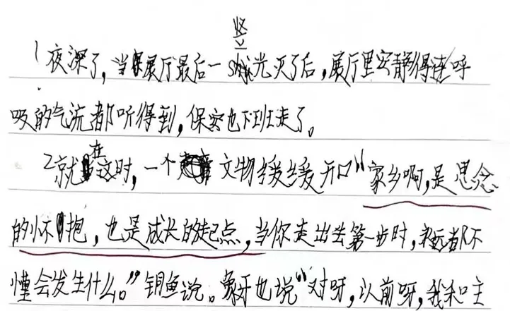比如去游乐场玩了一整天后,你可以用手机录音,从头到尾讲述自己在游乐场游玩的经历,印象深刻的事情可以多讲一点,特别是当时的细节、内心的想法和感受。讲完之后把这段录音发给AI,请它帮你整理成一篇日记。给AI时,一定要加上这条指令:“请忠实于我的原意,不要用华丽词语,不要用修辞手法,只做最小化改动。”你可能也留意到了,我反复强调:不要华丽词语,甚至不推荐你用太多修辞手法。很多人在写作的时候追求要把句子写漂亮,要把文章写得感人、写得深刻、打动人。这当然没错。但我经常见到,那些一上来就试图写得优美的孩子,恰恰是卡壳最多的孩子。比如,前段时间带孩子去博物馆上课,一个孩子开篇就写到“家乡啊,是思念的怀抱,也是成长的起点。”这句话很优美,但问题是,这样的写法一下把她架到了高处,仿佛接下来不写点更优美的,就接不上前面的句子。在她苦恼的时候,我说,你怎么想的,就怎么写,口语化也没关系。先努力做到:用文字毫无障碍地表达你的思想和感受。能熟练做到这一步了,再去考虑怎么样把文章写得优美。方式三:让AI当老师,帮你批改。