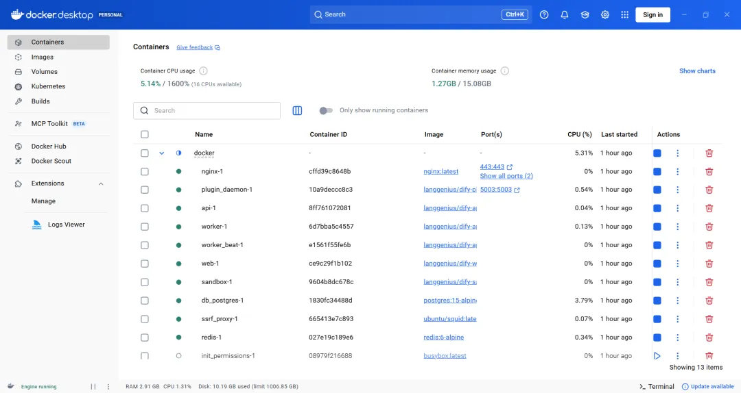 Dify官方提供了Docker一键部署。如果你还没装Docker,先去docker.com下载安装。我本地安装的docker desktop,详细安装过程略过,最终效果如下:
