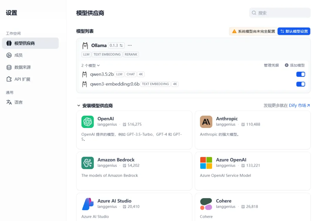 左边菜单:知识库、工具、应用、工作流,中间是操作区,右上角可以设置模型(比如添加OpenAI或通义千问的API Key)我使用的还是自己本地搭建的Ollama大模型服务。
