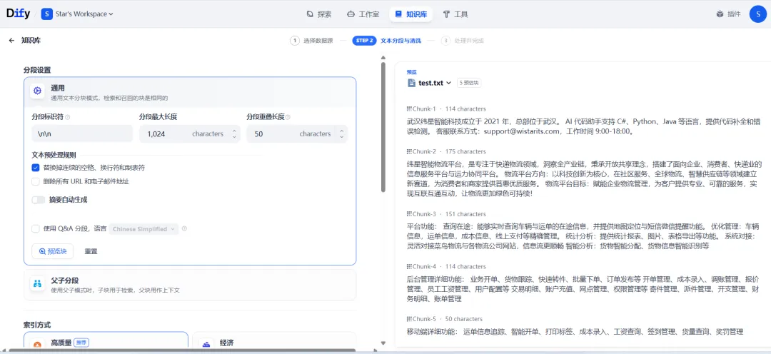 整个过程不到2分钟。你可以点进知识库,看到每个文本块已经被向量化,还能手动调整分段的长度。