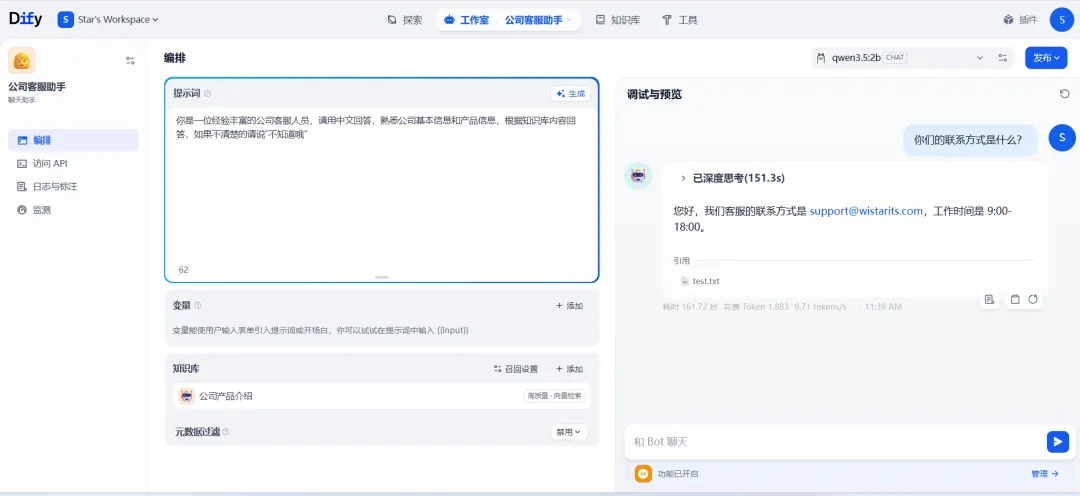 现在,运营同事可以自己登录Dify,添加或修改知识,机器人回答会实时更新。程序员终于不用当“知识搬运工”了。