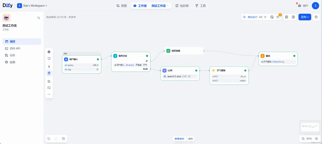 回到工作流,添加一个 “条件分支节点”:判断用户问题是否包含“天气”