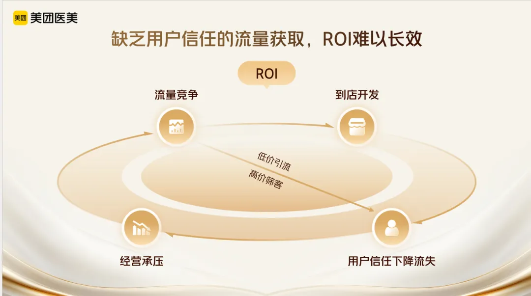 王丹将原因归结为一个负向循环:低价引流→到店过度开发→用户信任下降→经营承压→再次加码低价引流。同样的产品,平台上有人花1,700元进店,有人花6,700元,用户看不懂、不敢选,最终选择流失。"缺乏用户信任的流量获取,ROI难以长效。"对此,王丹提出:让产品与服务回归真实价值,用标准化建设打破信息不对称的行业乱象,这也是医美行业穿越周期的核心前提。