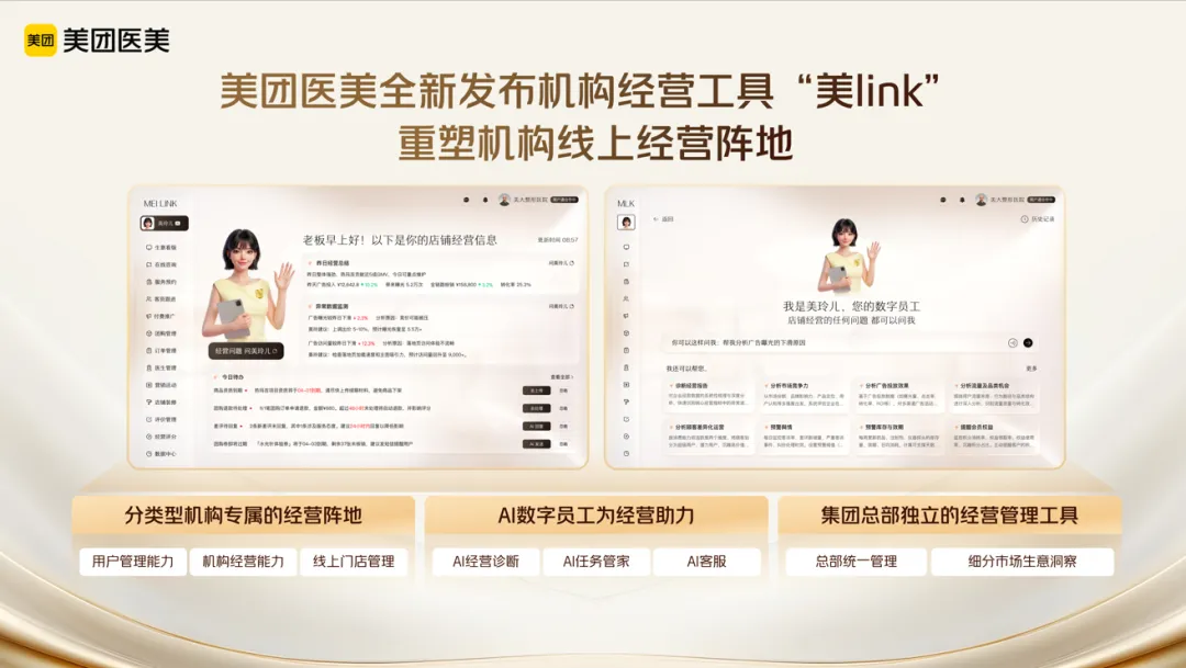 演讲现场,王丹正式发布美团医美专为医美机构量身打造的 AI 数智化经营工具 —— 美 link,该产品预计于 2025 年 5 月正式上线,是美团从 “流量平台” 进化为 “经营平台” 最具象化的落地载体。美 link 的核心定位是内嵌 AI 数字员工 “美玲儿” 的专属经营阵地,致力于成为下一代医美机构的核心经营助手。其核心能力覆盖机构经营全场景:一是打造专属经营阵地,1:1 精准还原机构线下真实经营场景,让用户线上访问的体验与到店消费感受高度一致,帮助机构构建专属、有温度的线上品牌阵地;二是实现 AI 全链路运营,依托平台丰富的用户数据,为机构提供精准用户标签、智能客资管理服务,同时支持 7×24 小时智能咨询应答,确保不遗漏任何商机;三是提供经营诊断,AI 数字员工可自动生成经营日报,实时同步平台用户需求、商圈竞争动态、广告投放效果等关键数据,帮助机构快速调整经营策略,实现精准获客、降本增效;四是强化连锁化赋能,支持连锁机构总部统一调度、赋能全国门店,实现品牌营销、品项管理、经营诊断的一体化管理,为连锁机构的规模化发展提供高效支撑。