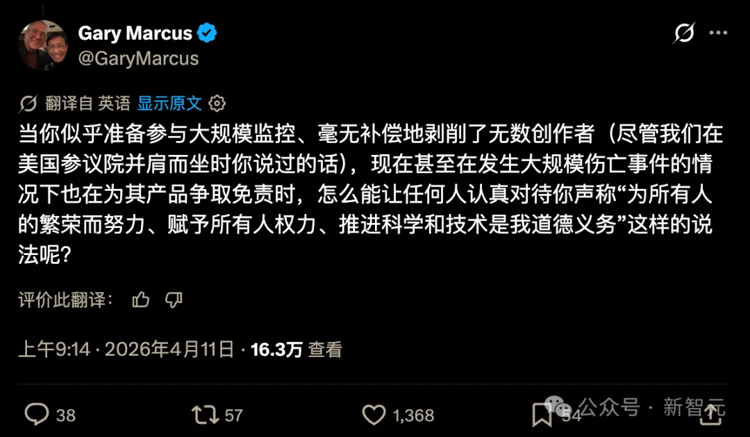 AI 圈知名批评家 Gary Marcus 直接在 Sam Altman 回应自己遭遇袭击的推文下方留言:你一边宣称自己在为所有人的繁荣负责,一边又愿意靠近大规模监控,训练数据争议迟迟说不清,对产品责任问题也不断拉扯,那这些道德宣言还剩多少说服力。