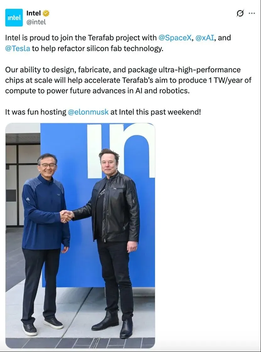 特斯拉是终端设备,本身就是数据入口;SpaceX是通信网络和空间基础设施,未来甚至可以承担一部分算力分发;xAI是模型能力;而现在通过和英特尔的合作,他开始试图补上最关键的一块——芯片和算力生产能力。